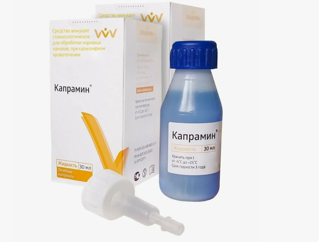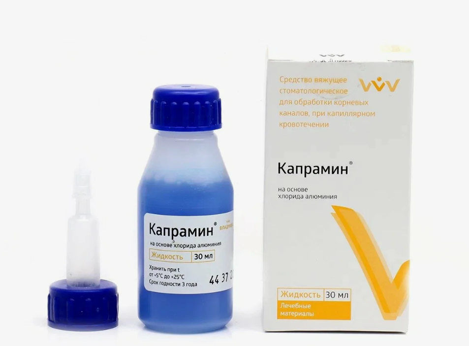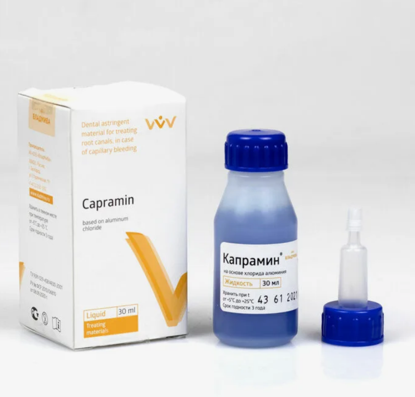 «Капрамин» — гемостатическая жидкость на основе хлорида алюминия, профессиональный стоматологический препарат. Производитель — компания «ВладМиВа» (Россия).